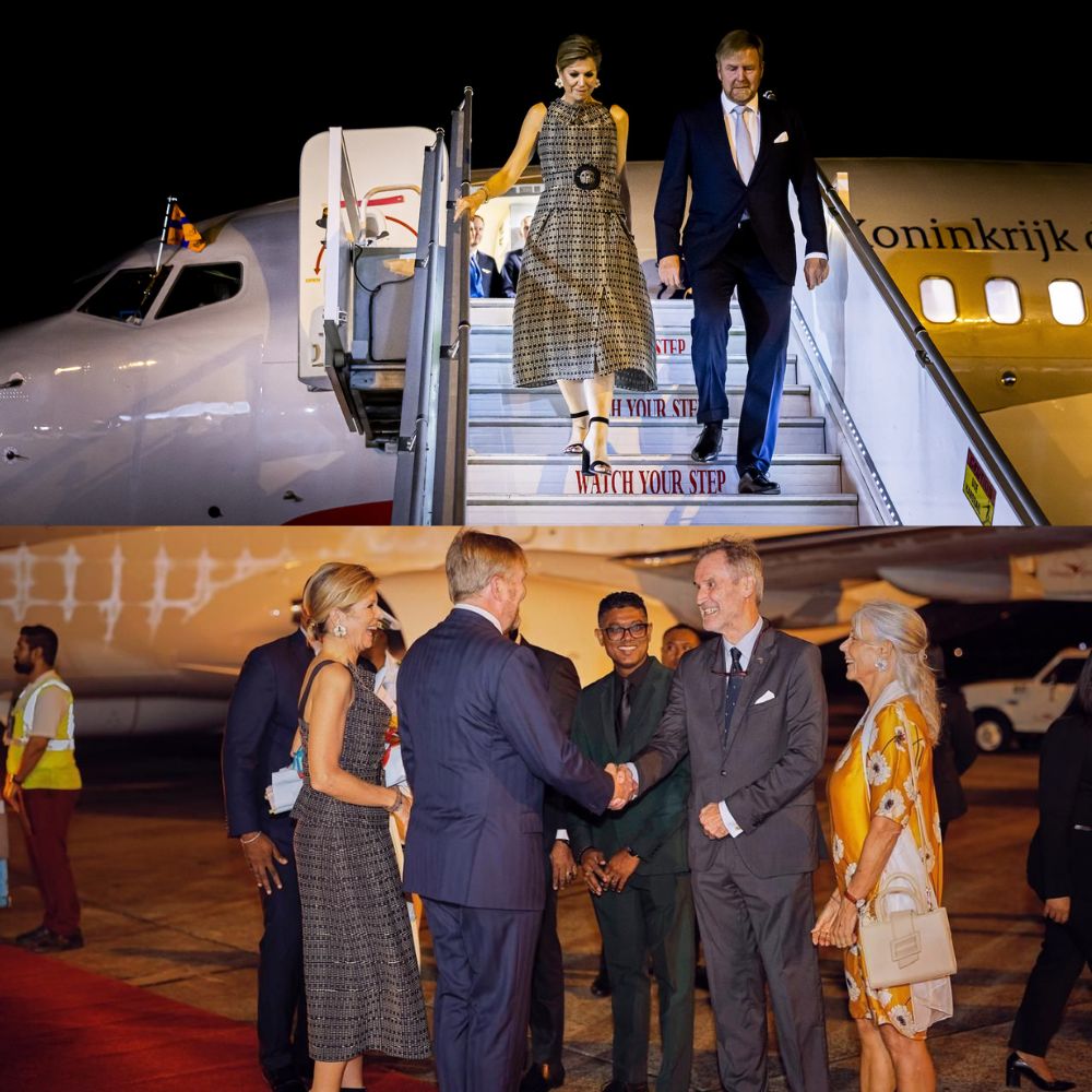 Bij aankomst werden Willem-Alexander en Máxima begroet door prominente figuren, waaronder de Surinaamse minister van Buitenlandse Zaken en de Nederlandse ambassadeur. Hand in hand liep het paar naar de klaarstaande auto, terwijl de traditionele klanken van de drums de aankomst extra bijzonder maakten.